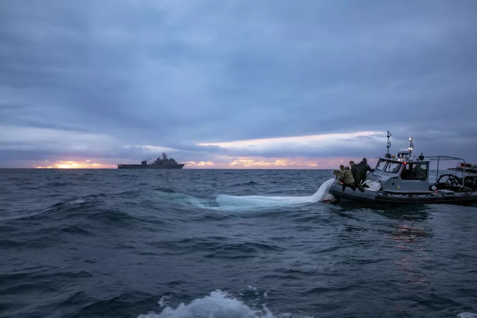 2023年2月5日,搜救人员在距离南卡罗来纳州海岸约6英里(10公里)的海面上打捞出一个中国监测气球的白色残骸。(图片来源:美国海军照片,由一级大众传播专家泰勒・汤普森拍摄)