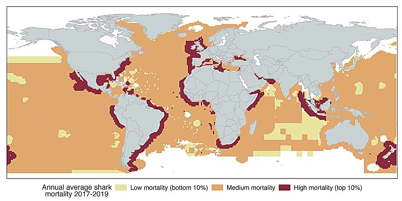 超过30%的渔获量是目前濒临灭绝的物种。当考虑到没有按物种正确识别的鲨鱼时,2019年全球死亡率估计上升到1.01亿条鲨鱼。