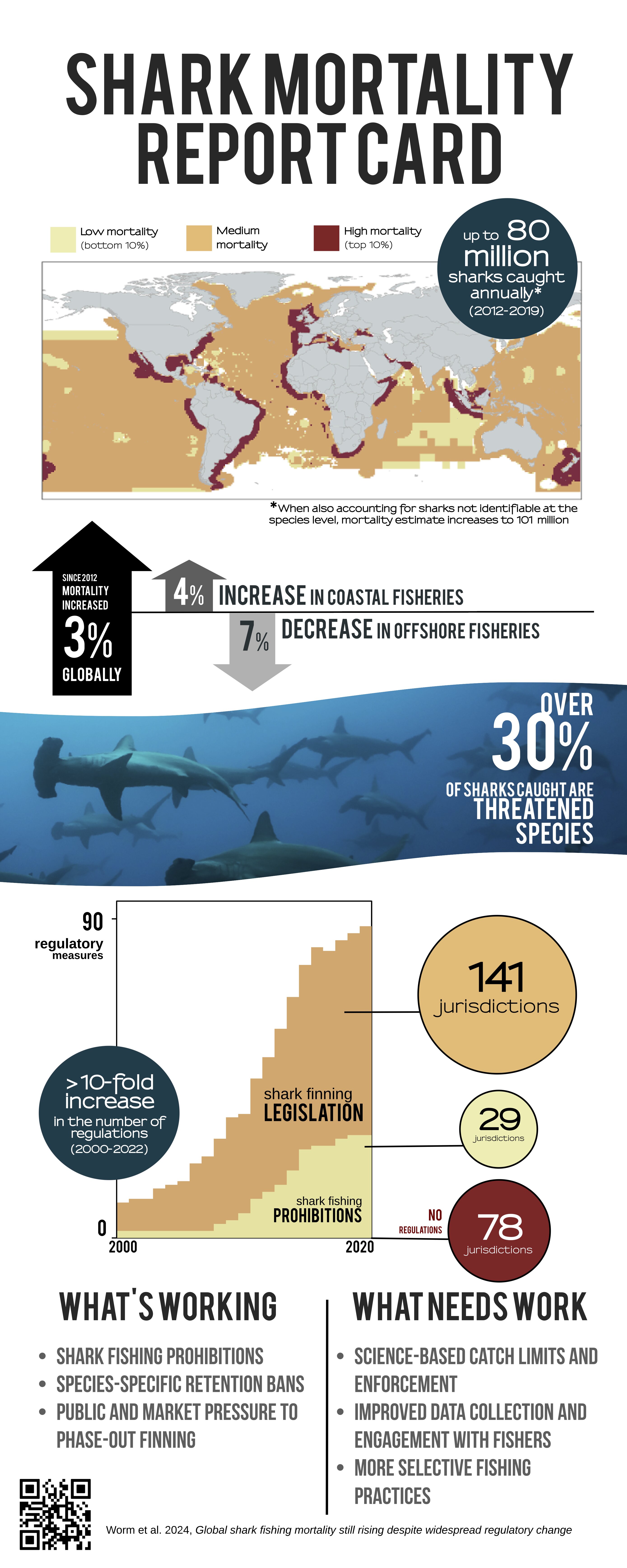 “我们表明,旨在防止鲨鱼鳍的广泛立法在解决这种浪费行为方面是成功的,但并没有降低整体死亡率,”主要作者鲍里斯・沃姆说,他是新斯科舍省达尔豪西大学生物系的研究教授。“太多的鲨鱼仍在死去;这对锤头鲨等濒危物种来说尤其令人担忧。”
